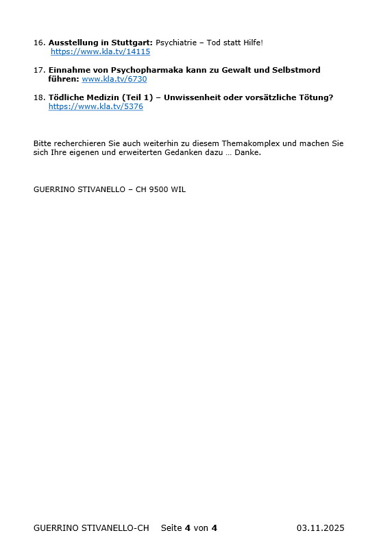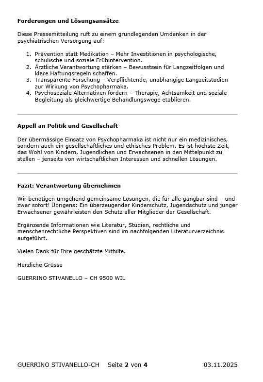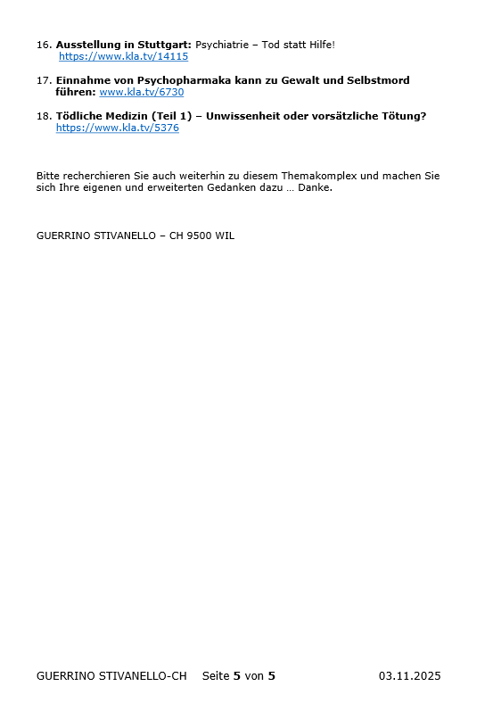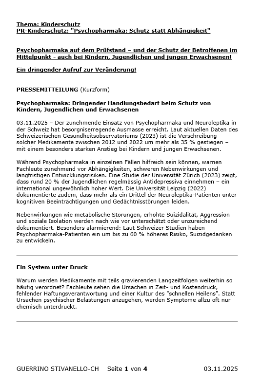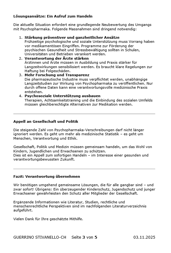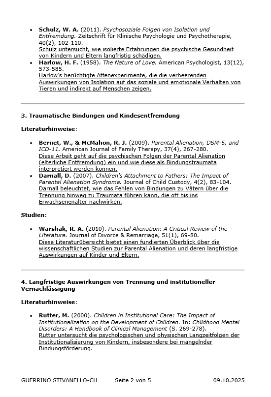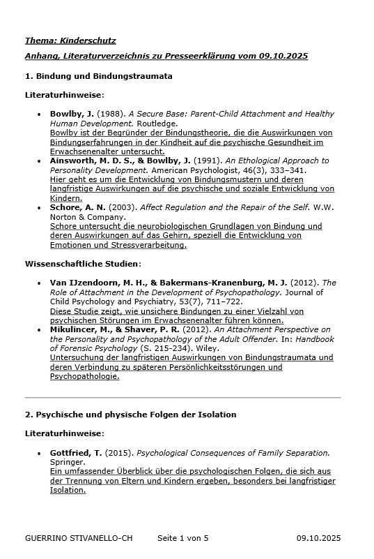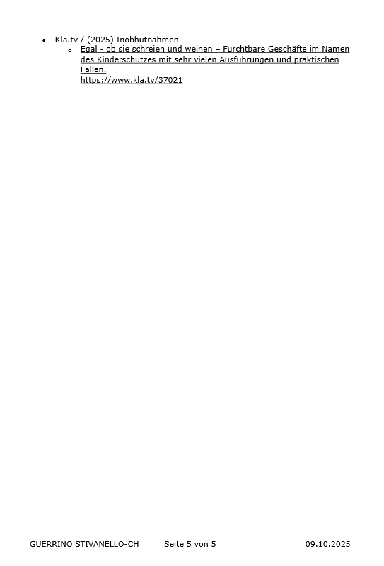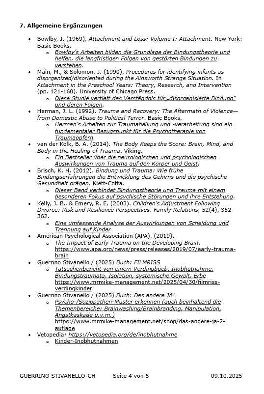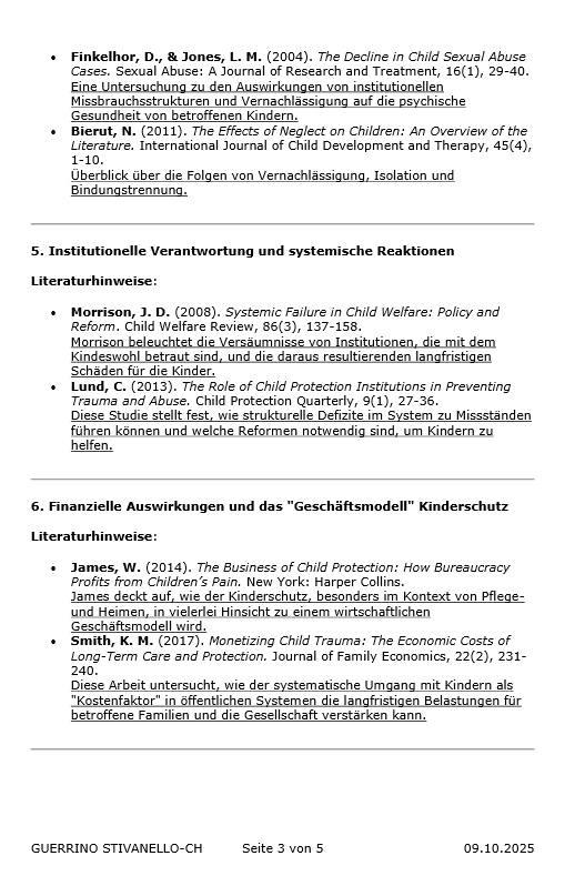 Inobhutnahme, Bindungstraumata, Isolation, Physische/Psychische Gewalt, psychische Folter und ihre Folgen, Kindesentfremdung, Medikamente, Drogen, Psychopharmaka, institutionelle Vernachlässigung, systemische Reaktionen, Geschäftsmodell/Kinderschutz, Erbe, allgemeine praktische Ergänzungen.