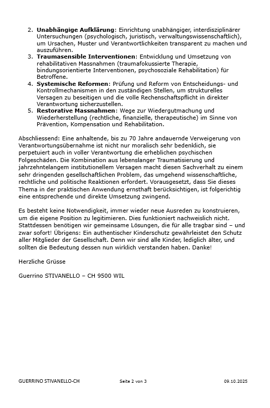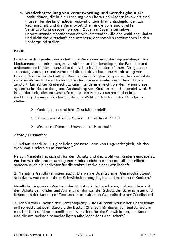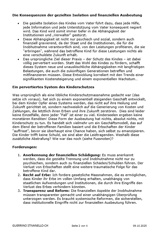 Inobhutnahme, Bindungstraumata, Isolation, Physische/Psychische Gewalt und ihre Folgen, Kindesentfremdung, institutionelle Vernachlässigung, systemische Reaktionen, Geschäftsmodell/Kinderschutz, Erbe, allgemeine praktische Ergänzungen.